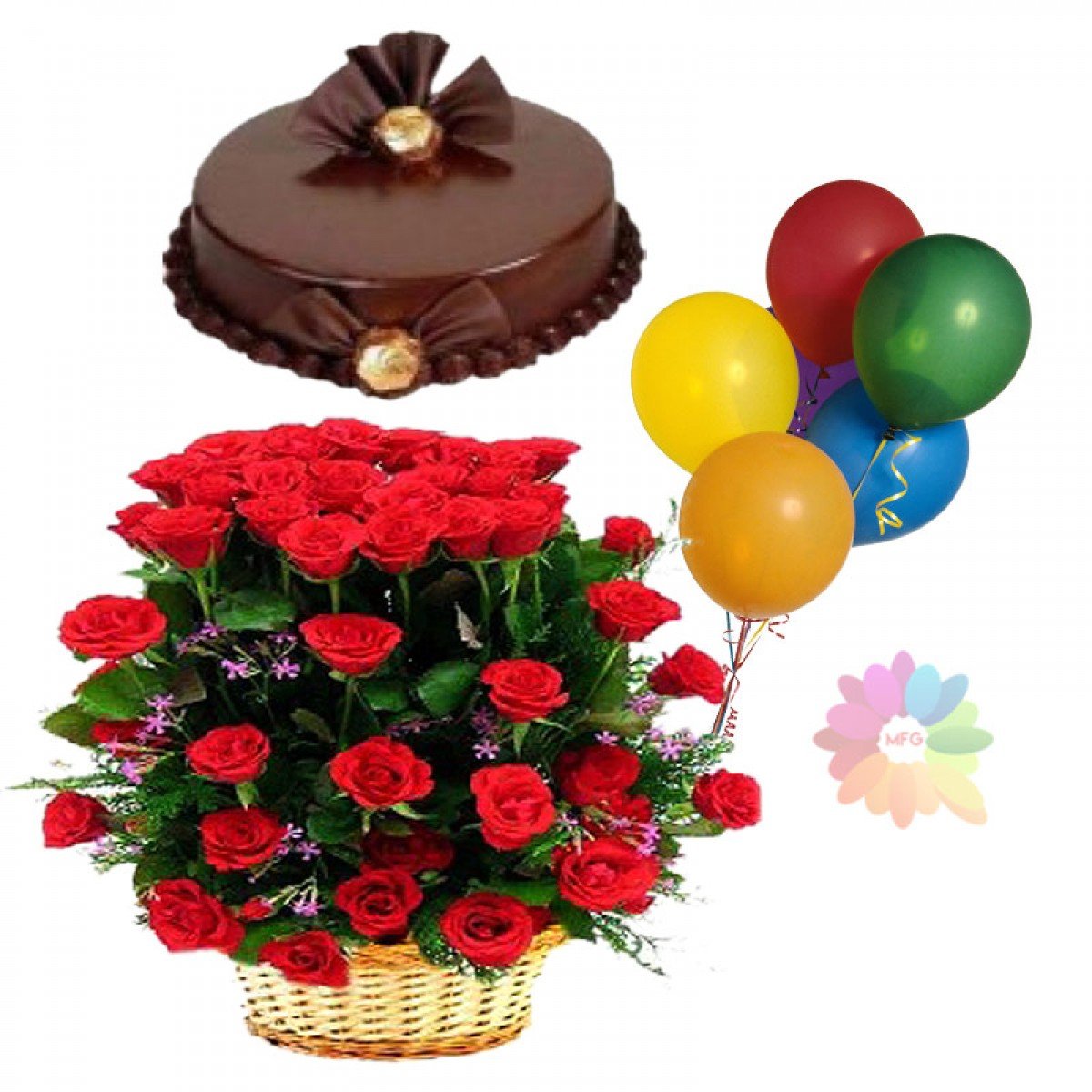 36 red roses basket& cake and 5 birthday balloonschocolate cake design may vary