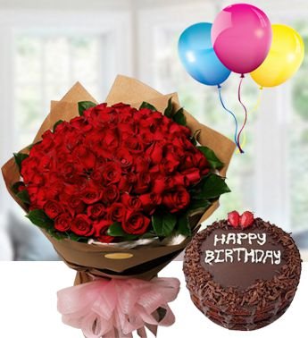 50 red rose bunch , chocolate cake & happy birthday ballons
