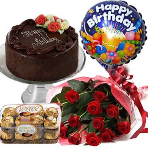 Birthday Combo12 red roses bunch chocolate cake, cake design may vary HAppy birthday Maylor balloons 200 g ferrero