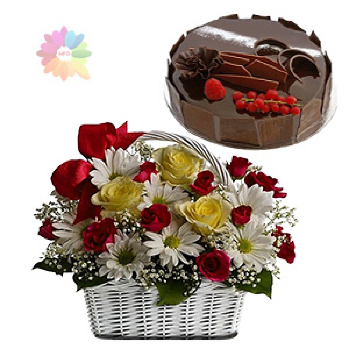 birthday combo24 Mix Roses arranged in a Basket, 1/2 Kg Chocolate Cake, Teddy Bear 8 inch, Ferrero Rocher 16 Pcs + happy birthday Card