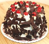 Black ForestThree (3) layers of choco sponge cake, moistened with fully aged liquor filled w/ cream & glazed cherries. Covered w/ choco shavings; top is decorated w/ flower icing & cherry slices.