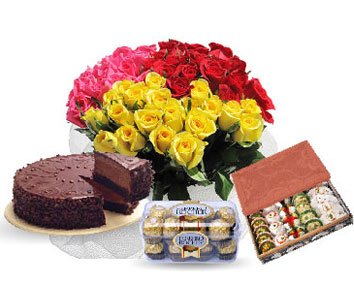 Flowers Combo Gifts36 Mix Roses Bunch brownies in a box with 1 Kg chocolate Cake and 16 Ferrero