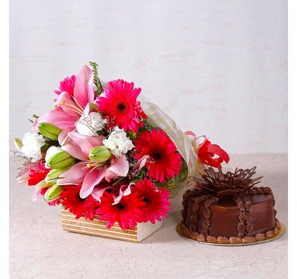 Pink Lilies and Gerberas with Chocolate CakeNo Product Detail Available