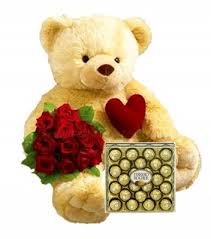 24" teddy, 12 roses bunch , pillow & 24 ferrero