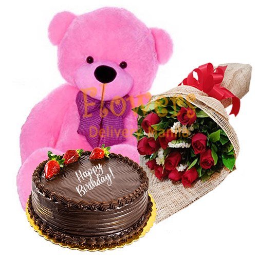 COMBO # 1004 ft teddy brown/pink 12 red roses bouquet chocolate cake