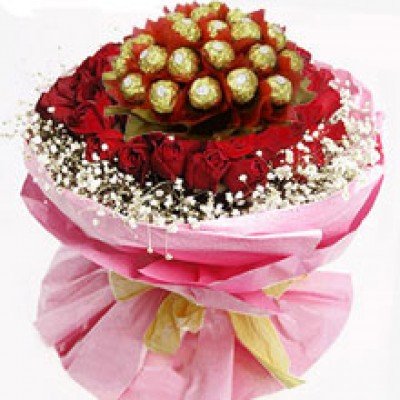 Red roses with ferrero12 Red roses with 16 ferrero rochers inside.