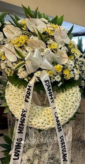 yellow and white round funeral standeeA thoughtful and elegant expression of sympathy, this tasteful basket is a mix of pink roses and spray roses, white hybrid lilies and more.