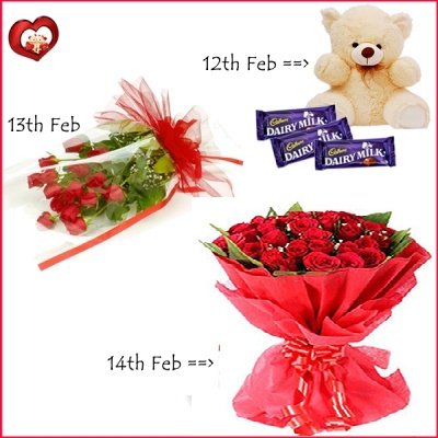 Valentine's 3 Days FantasyTo impress your loved ones send this lovely not only for one day, but its for three days which shows how much they mean for you and its simply reflect your love. This 3 Days Serenade includes :12th Feb - A cute teddy bear (8 inches) with 3 bars of cadbury dairy milk chocolates (60 g each) 13th Feb - Bunch of 12 red roses. 14th Feb - Bunch of 24 Red Roses with a special Valentine Greeting Card.